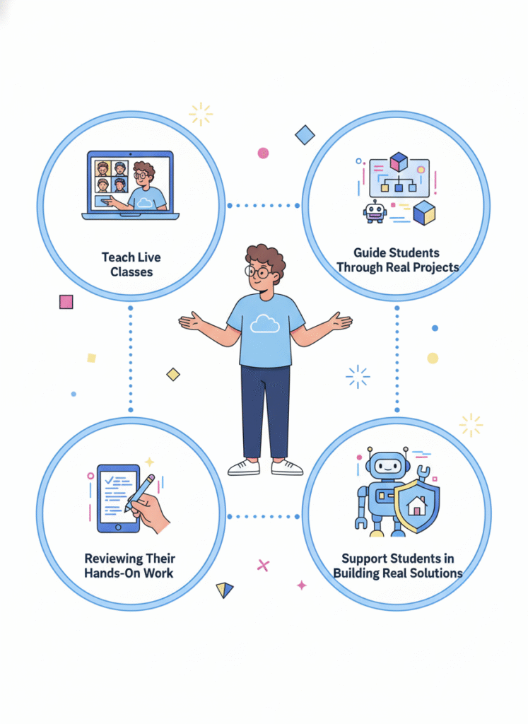 As a mentor, you will help students understand complex concepts, review their work, guide their projects, and support them in building confidence in their skills.